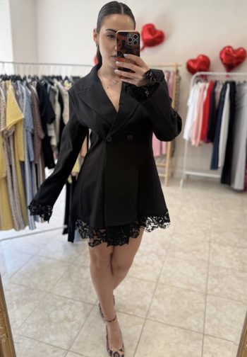 Εντυπωσιακό Blazer Dress με ρομαντικές λεπτομέρειες δαντέλας. Διαθέτει μεσάτη γραμμή που κολακεύει τη σιλουέτα, βάτες για δυναμικό στυλ και πλήρη φόδρα για άψογη εφαρμογή. Το απόλυτο must-have για statement εμφανίσεις.