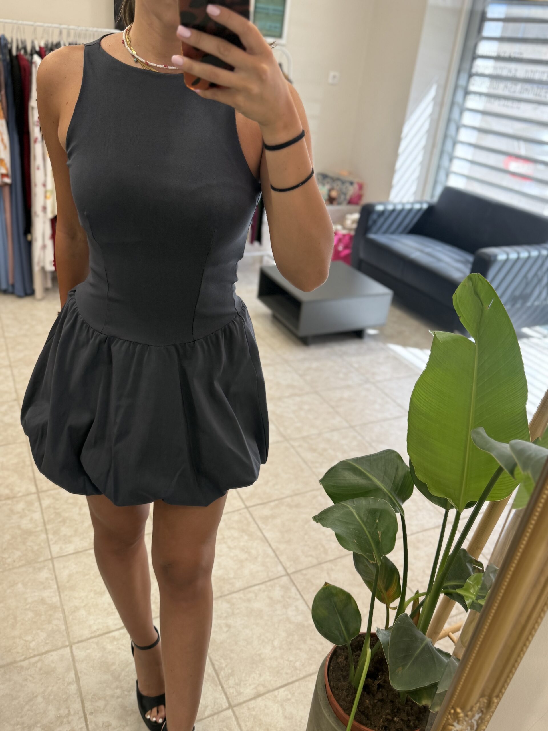 Mini balloon φόρεμα ανθρακί με κοψίματα σε ώμους και λαιμό, φερμουάρ στην πλάτη και εφαρμογή που αγκαλιάζει τέλεια τη σιλουέτα. Ιδανικό για κομψές εμφανίσεις με στυλ.
