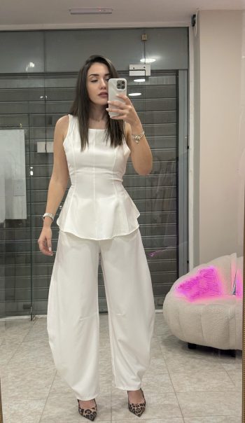 Floral set με κομψό μπούστο και παντελόνι σε ύφασμα τύπου κοστουμιού. Διαθέτει ενίσχυση στο στήθος και λάστιχο στην πλάτη για άνετη εφαρμογή, ενώ το παντελόνι έχει ζωνάκι, κουμπί και φερμουάρ. Ιδανική επιλογή για chic εμφανίσεις από το πρωί έως το βράδυ.