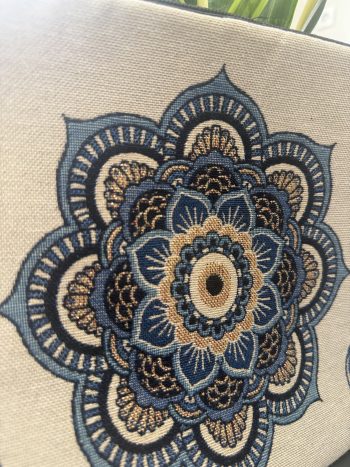 Υφασμάτινο νεσεσέρ με μπλε μαντάλα, ματάκια και χρυσή εσωτερική κλωστή, που συνδυάζει boho και ethnic αισθητική.